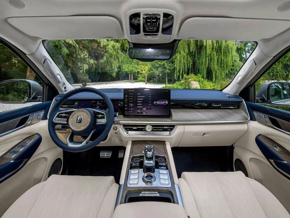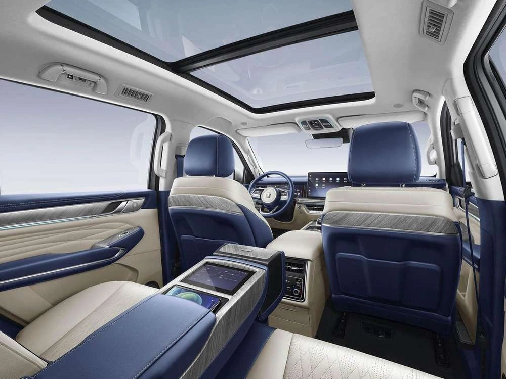 • Центральный подлокотник сидений заднего ряда с подстаканниками, отсеком для хранения и сенсорным экраном управления функциями автомобиля